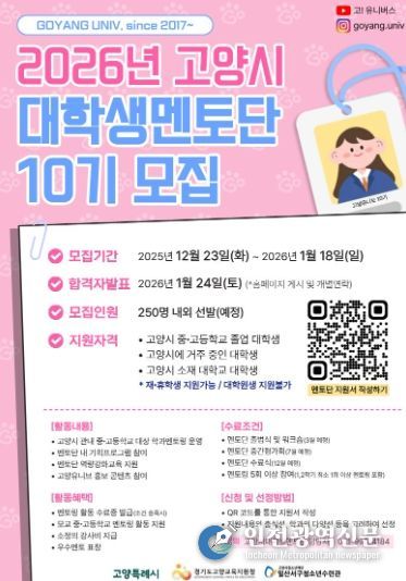 [인천광역신문] 박진 기자 | 고양특례시가 지역 청소년들의 진로 설계를 도울 대학생 멘토단 ‘고양유니브’의 2026년도 신입 단원을 1월 18일까지 모집한다고 밝혔다.