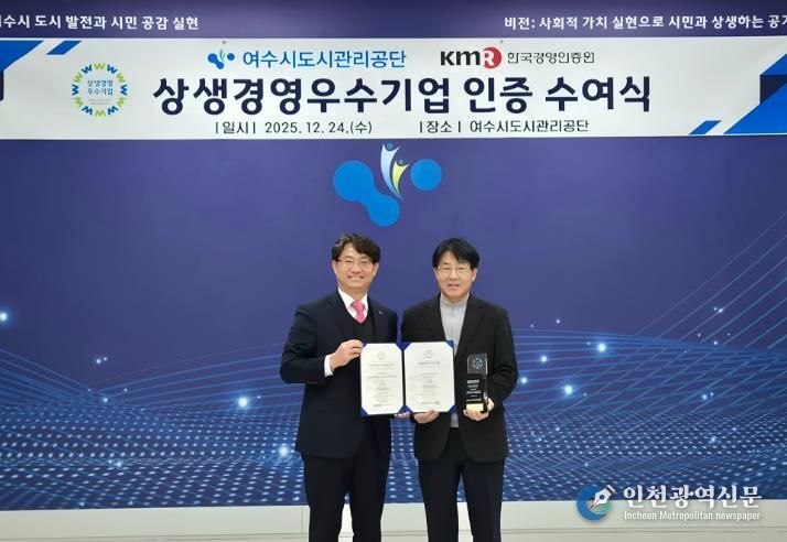 [인천광역신문] 박진 기자 | 여수시도시관리공단은 상생경영 실천 성과를 인정받아 한국경영인증원으로부터 ‘상생경영 우수기업’ 인증을 2년 연속 획득했다고 24일 밝혔다.
