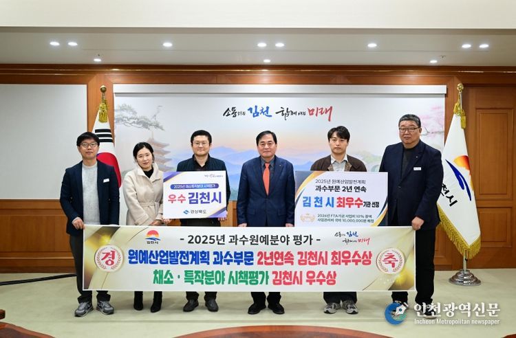 [인천광역신문] 박진 기자 | 김천시가 올해 농식품부 주관 원예산업발전계획 과수부문 연차평가에서 지난해에 이어 2년 연속 1등급(최우수) 기관으로 선정되며 과수산업 경쟁력을 다시 한번 입증했다.