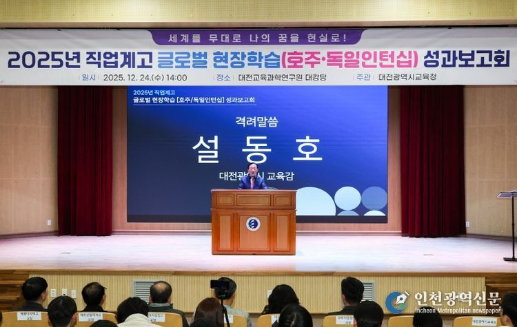 [인천광역신문] 박진 기자 | 대전시교육청은 12월 24일 대전교육과학연구원에서‘2025년 직업계고 글로벌 현장학습 성과보고회’를 개최했다고 밝혔다. 이번 보고회는 올해 호주·독일 인턴십 프로그램에 참여한 학생들의 성과를 공유하고, 다음 연도 참가 희망학생과 학부모에게 프로그램 운영 내용을 안내하기 위해 마련됐다.