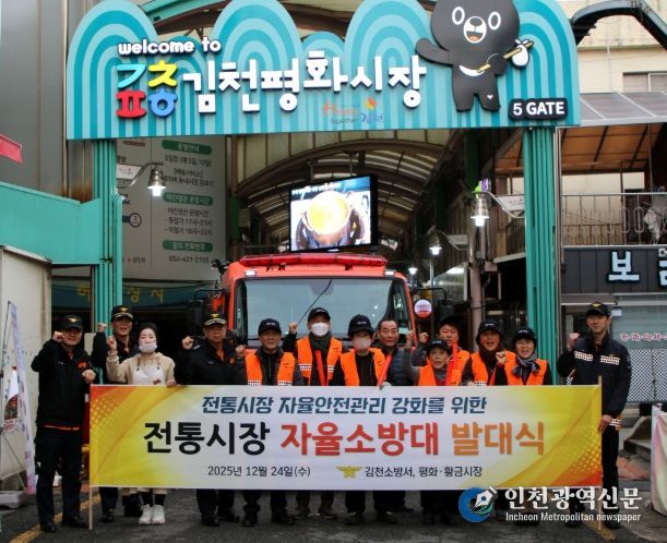 [인천광역신문] 박진 기자 | 김천소방서는 24일, 김천시 평화시장에서 '전통시장 자율소방대 발대식'을 개최하고 전통시장 화재 예방 및 초기 대응 역량 강화에 나섰다.