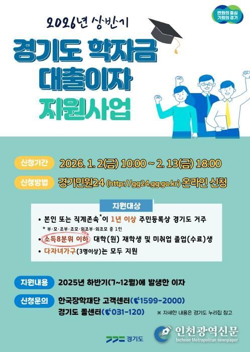 [인천광역신문] 박진 기자 | 경기도가 오는 2월 13일까지 ‘2026년 상반기 경기도 대학생 학자금 대출이자 지원사업’ 신청자를 접수한다.