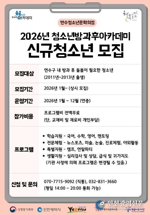 [인천광역신문] 박진 기자 | 연수청소년문화의집은 연수구 내 14~16세 청소년(2011~2013년 출생)을 대상으로 2026년 ‘청소년방과후아카데미’ 신입생을 모집한다.