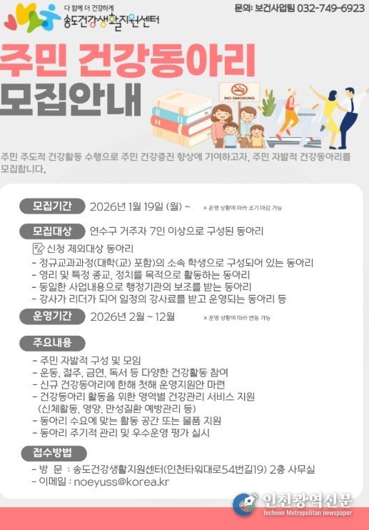 [인천광역신문] 박진 기자 | 연수구 송도건강생활지원센터는 주민들의 자발적인 건강 증진 활동을 지원하기 위해 오는 19일부터 ‘주민 참여형 건강동아리’를 모집한다.