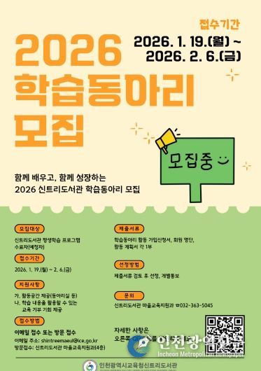 [인천광역신문] 박진 기자 | 인천광역시교육청신트리도서관은 지역주민의 자발적인 학습 문화 조성과 지속 가능한 마을 학습공동체 형성을 위해 2026년 학습동아리를 모집한다.
