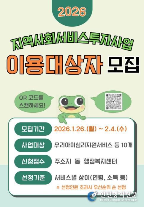 [인천광역신문] 박진 기자 | 수원특례시는 1월 26일부터 2월 4일까지 ‘2026년 지역사회 서비스 투자사업’ 이용자를 모집한다.