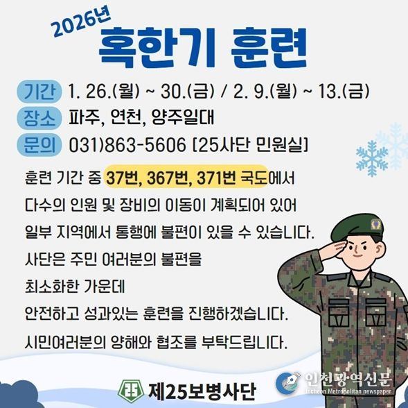 [인천광역신문] 박진 기자 | 육군 제25보병사단이 2026년 1월 26일부터 30일까지 파주시ㆍ양주시 일대에서, 2026년 2월 9일부터 13일까지 파주시ㆍ양주시ㆍ연천군 일대에서 각 1주간 혹한기 훈련을 실시한다.