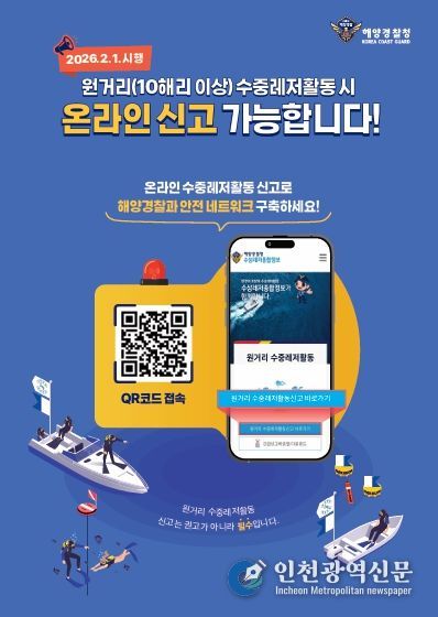 [인천광역신문] 박진 기자 | 중부지방해양경찰청은 원거리 수중레저 활동자의 안전관리를 강화하고 현장 대응의 효율성을 높이기 위해 원거리 수중레저 활동 신고 방법을 개선한다고 밝혔다.