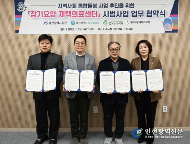[인천광역신문] 박진 기자 | 울산 남구는 지역 내 거동불편 어르신들의 건강한 재가생활 지원을 위해 22일 남구청에서 굿모닝한의원, 아주재활의학과의원, 보건소 등과 ‘장기요양 재택의료센터’ 시범사업 업무협약식을 개최했다.