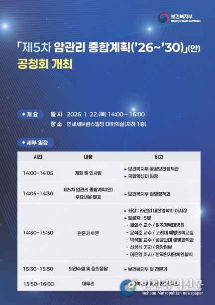 [인천광역신문] 박진 기자 | 보건복지부는 1월 22일 오후 2시 연세세브란스빌딩 (서울특별시 중구 소재)에서 '제5차 암관리 종합계획(’26∼’30)'(안)에 대한 공청회를 개최한다고 밝혔다.