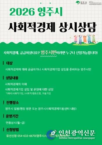 [인천광역신문] 박진 기자 | 영주시와 영주시사회적경제지원센터는 사회적경제에 대한 시민들의 이해를 높이고 신규 사회적경제기업 발굴을 지원하기 위해 ‘2026 영주시 사회적경제 상시상담’을 연중 운영한다고 밝혔다.