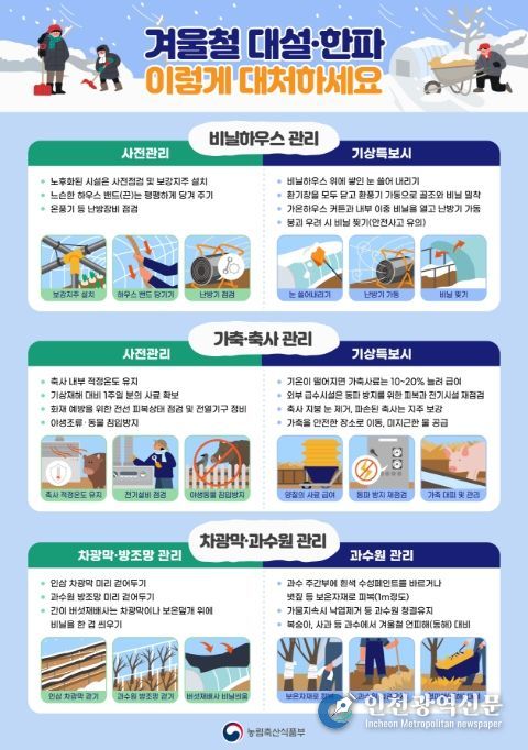 도는 겨울철 가축·축사 사전 관리 요령으로 기상 재해에 대비해 1주일 분의 사료를 확보하고, 한파 특보 발효 시에는 사료 급여량을 10~20% 늘릴 것을 권고했다. 또 외부 급수시설의 동파 방지를 위한 보온 조치와 전기 시설 점검, 노후 축사와 파손 시설에 대한 보강·응급 복구를 통해 피해를 줄여야 한다고 강조했다.