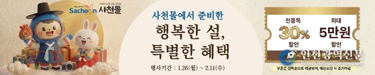 [인천광역신문] 박진 기자 | 사천시가 2026년 설을 맞이해 1월 26일부터 2월 11일까지 사천시 특산물 온라인 쇼핑몰인 '사천몰'에서 전품목 30%할인 행사를 실시한다.