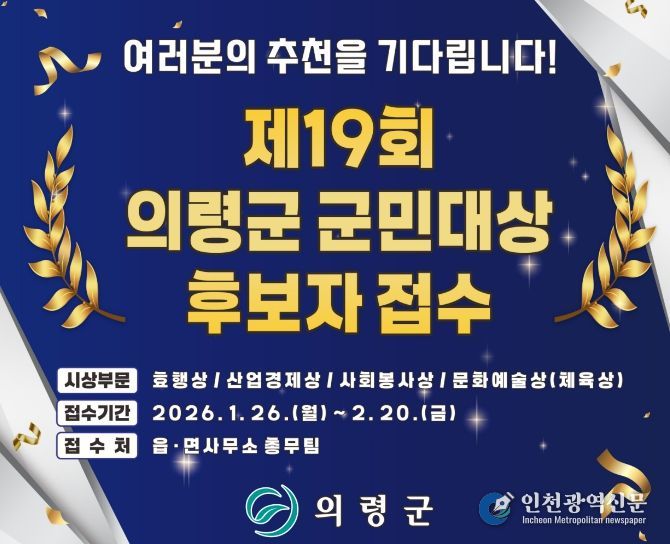 [인천광역신문] 박진 기자 | 의령군은 1월 26일부터 2월 20일까지 2026년 의령군 군민대상 후보자 추천 접수를 실시한다고 밝혔다.