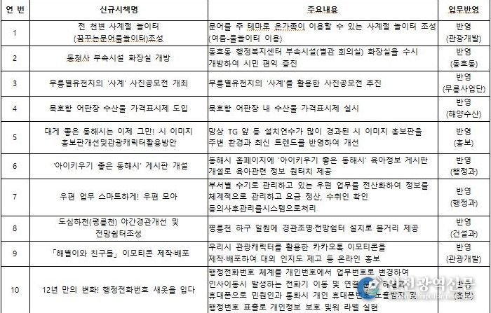 동해시는 지난 2024년부터 직원 제안 정책 발굴 제도를 운영해 왔으며, 직원들이 제안한 아이디어 55건 가운데 10건의 신규 시책을 실제 시정에 반영해 추진하는 성과를 거뒀다.