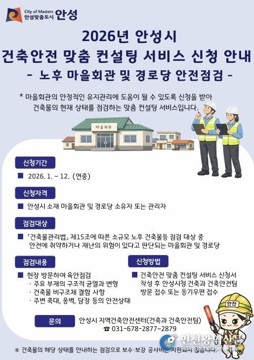 [인천광역신문] 박진 기자 | 안성시는 올해 ‘건축안전 맞춤 컨설팅 서비스(노후 마을회관 및 경로당 안전점검)’를 시행한다고 밝혔다.