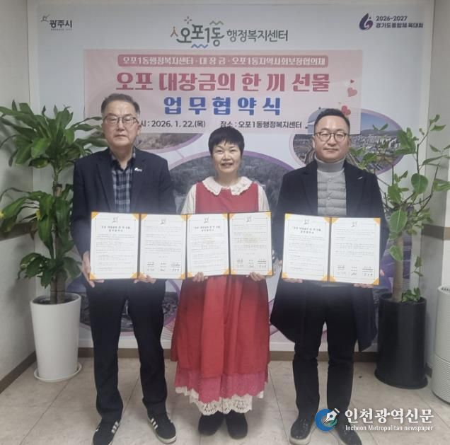 [인천광역신문] 박진 기자 | 광주시 오포1동은 지난 22일 지역 내 음식점 대장금, 오포1동 지역사회보장협의체와 함께 저소득 취약계층의 식생활 지원을 위한 ‘오포 대장금의 한 끼 선물’ 업무협약을 체결했다.
