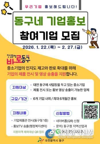 [인천광역신문] 박진 기자 | 대전 동구는 다음 달 27일까지 ‘동구네 기업홍보’ 사업에 참여할 지역 중소기업을 공개 모집한다고 23일 밝혔다.