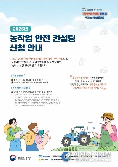 [인천광역신문] 박진 기자 | 여주시농업기술센터는 지난 1월 5일부터 2월 13일까지 농작업 안전보건관리 컨설팅 참여 농가를 모집한다. 이번 사업은 농작업 중 발생할 수 있는 사고를 예방하기 위해 마련됐으며 모집 규모는 110농가 내외다. 접수는 선착순으로 마감한다.