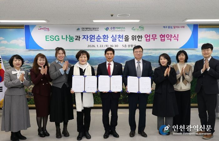 [인천광역신문] 박진 기자 | 대구 달서구는 지난 22일, E-순환거버넌스 및 (사)자원순환사회연대와 함께 폐전기·전자제품의 친환경 회수와 재활용을 위한 ‘Zero Waste, 자원순환 실천 업무협약’을 체결했다.