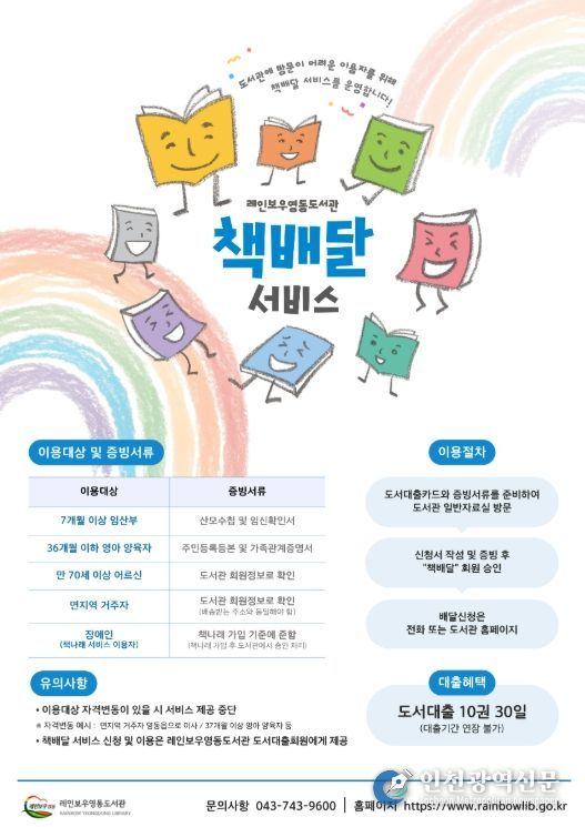 [인천광역신문] 박진 기자 | 충북 영동군 레인보우영동도서관은 도서관 방문이 어려운 취약계층의 독서 편의 제공을 위해 도서를 가정으로 배달해 주는 ‘책배달 서비스’를 운영한다고 밝혔다.