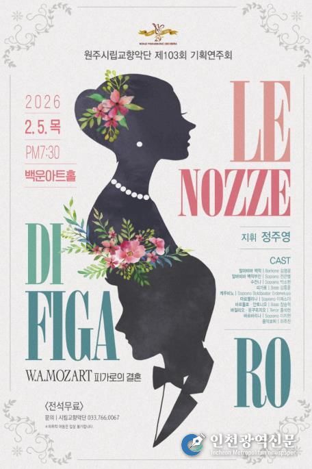 [인천광역신문] 박진 기자 | 원주시립교향악단은 오는 2월 5일 오후 7시 30분 백운아트홀에서 제103회 기획연주회 ‘피가로의 결혼’을 개최한다.