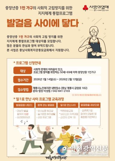 계룡시 관계자는 “이번 프로그램은 중장년층 1인 가구의 사회적 고립을 사전에 예방하고 지역사회와의 연결을 돕기 위한 참여형 복지사업”이라며 “관심 있는 시민들의 적극적인 참여를 바란다”고 말했다.