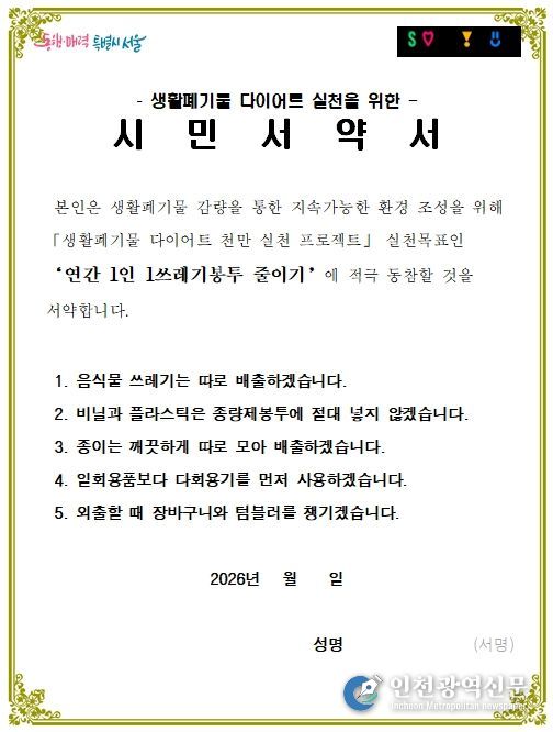 시민 실천서약은 음식물쓰레기 분리배출, 비닐·플라스틱 종량제봉투 혼입 금지, 종이류 분리배출, 다회용기 우선 사용, 장바구니·텀블러 지참 등 실생활에서 참여할 수 있는 항목으로 구성될 예정이다.
