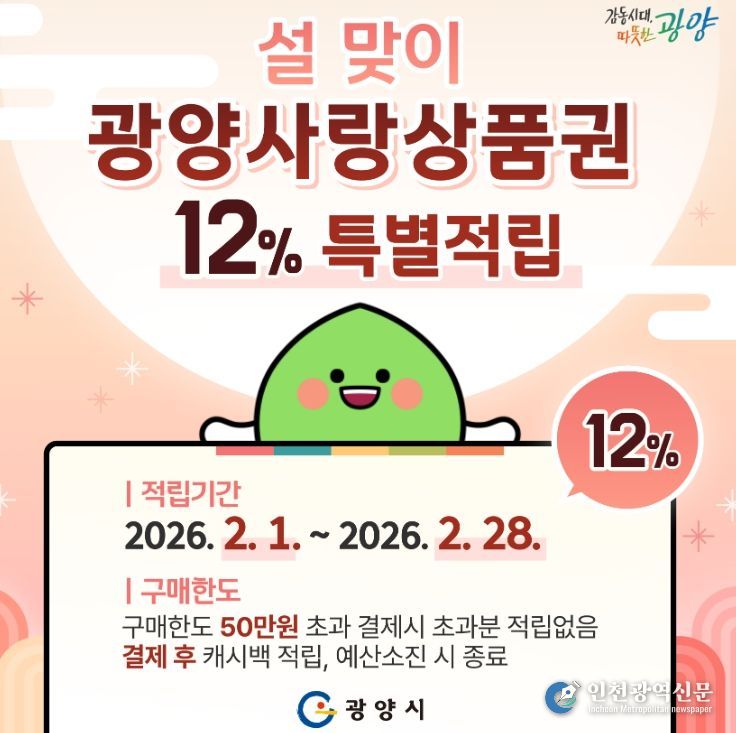 [인천광역신문] 박진 기자 | 광양시는 설 명절을 맞아 지역 내 소비를 촉진하고 민생경제 회복을 지원하기 위해 2월 1일부터 28일까지 한 달간 광양사랑상품권 캐시백 적립률을 기존 10%에서 12%로 한시 상향 운영한다고 밝혔다.
