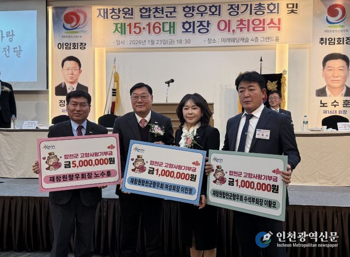 이날 행사에서는 제16대 노수훈 신임 회장이 고향사랑기부금 500만 원을 기탁했으며, 재창원합천군향우회 이민정 여성회장과 이황모 수석부회장도 각각 100만 원씩을 기탁해 고향 발전에 힘을 보탰다.