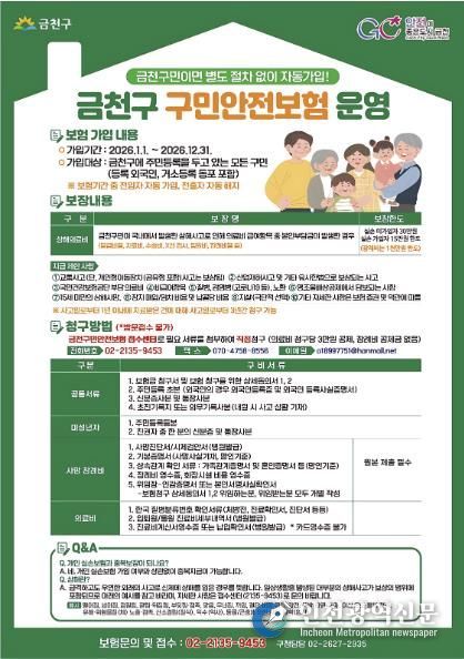 [인천광역신문] 관리자 기자 | 금천구는 2023년 하반기부터 금천구 모든 구민을 대상으로 시행하고 있는 ‘구민안전보험’을 올해부터 일부 보장 기준을 개선해 운영한다고 밝혔다.