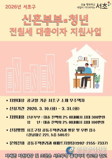 [인천광역신문] 관리자 기자 | 서울 서초구가 가파른 대출 금리 인상과 주거비 부담으로 어려움을 겪고 있는 무주택 신혼부부와 청년들에게 ‘2026년 전월세 보증금 대출이자 지원사업’을 시행한다고 밝혔다. 전월세 보증금 대출이자 지원사업은 경제적 자립 기반이 약한 무주택자 신혼부부와 청년들의 안정적인 정착을 돕기 위해 전월세 보증금 대출이자를 신혼부부에게는 연 300만 원, 청년에게는 연 100만 원까지 지원하는 사업이다.