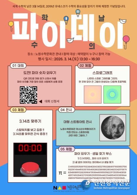 [인천광역신문] 관리자 기자 | 서울 노원구는 세계 수학의 날을 맞아 오는 14일 노원수학문화관에서 '2026 파이데이' 행사를 개최한다고 밝혔다.