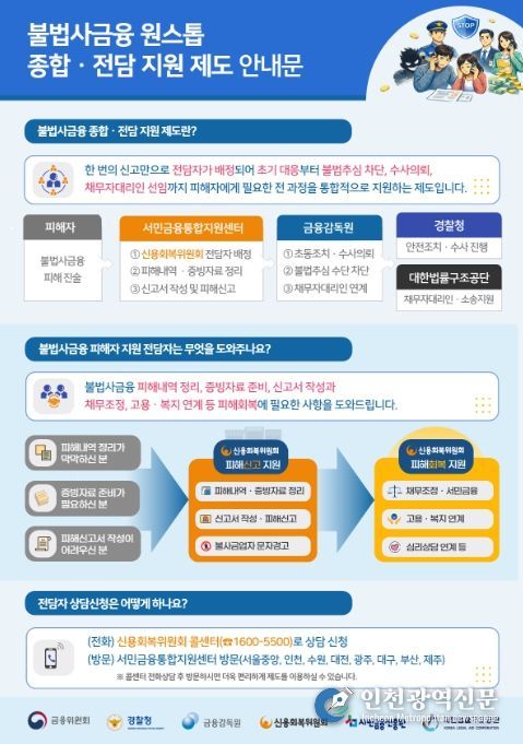 [인천광역신문] 관리자 기자 | 불법사금융은 단순한 대출이 아닌, 채무자가 위법·부당한 계약을 체결하도록 유도하고 불법추심으로 금전을 갈취하는 행위로서, 개인 뿐 아니라 가정과 사회를 파괴하는 악질적인 민생침해 금융범죄에 해당한다. 그간 불법사금융 피해자가 불법사금융을 차단하고 피해를 구제받고자 할 경우 금융감독원, 경찰, 지방자치단체, 기타 지원기관 등에 기관별로 일일이 신고하면서, 피해사실을 각 기관에 반복적으로 설명하고 관련 자료를 직접 준비하여 제출해야 하는 등 어려움을 겪어왔다. 특히 이 과정에서 불법사금융업자의 불법추심행위가 즉시 중단되지 않고 지속될 경우, 피해자가 심적·육체적으로 피로감을 느껴 피해 구제를 포기하는 경우도 존재했다.