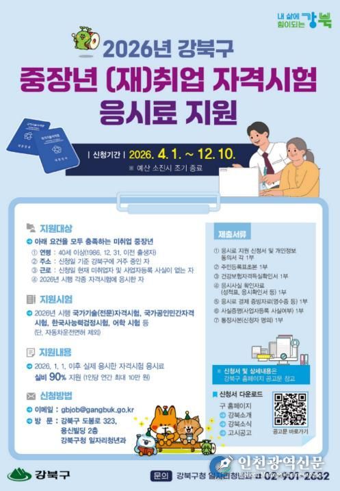 [인천광역신문] 관리자 기자 | 서울 강북구는 미취업 중장년의 취업 역량 강화를 위해 ‘중장년 (재)취업 자격시험 응시료 지원사업’을 오는 4월부터 추진한다고 밝혔다.