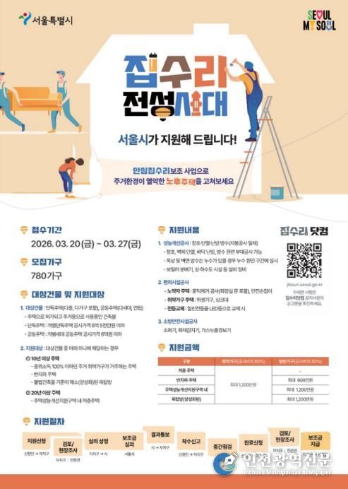 [인천광역신문] 관리자 기자 | 서울시 은평구는 주거 취약가구 및 반지하 주택 등의 집수리 비용을 지원하는 ‘안심 집수리 보조사업’을 실시한다고 밝혔다.