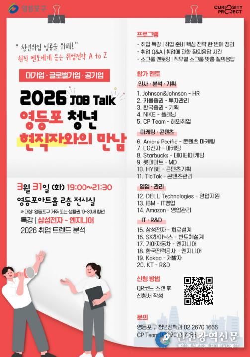[인천광역신문] 관리자 기자 | 영등포구가 오는 31일 영등포아트홀 2층 전시실에서 기업의 전‧현직자를 초청하여 생생한 취업 전략을 듣는 ‘현직자와의 만남’을 개최한다고 밝혔다.