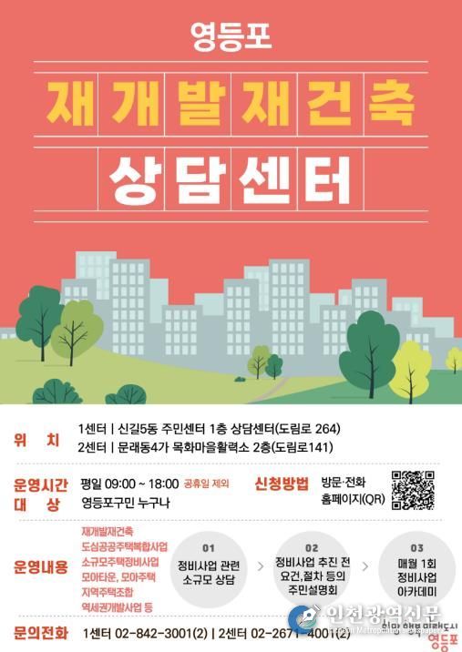 영등포 재개발‧재건축 상담센터는 전문적인 상담을 통해 행정과 주민, 주민과 주민을 잇는 소통 창구로서 정비사업의 투명성을 높이고 원활한 사업 추진을 돕고 있다. 센터는 신길5동 주민센터 1층과 문래동 목화마을활력소 2층에 위치해 있으며, 평일 오전 9시부터 오후 6시까지 운영한다.