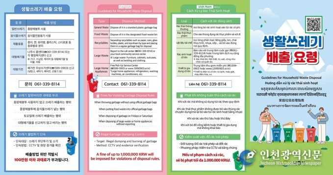 시는 먼저 생활폐기물 부적정 배출을 예방하기 위해 내국인뿐 아니라 외국인 거주자를 대상으로 생활폐기물 배출 방법을 안내하는 다국어 홍보물을 제작해 배포했다.