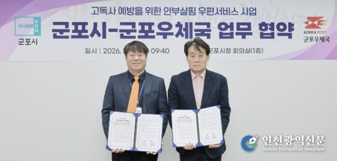 [인천광역신문] 관리자 기자 | 군포시는 3월 12일 군포시청에서 군포우체국과 사회적 고립가구 지원을 위한 ‘안부살핌 우편서비스’ 업무협약을 체결했다고 밝혔다.