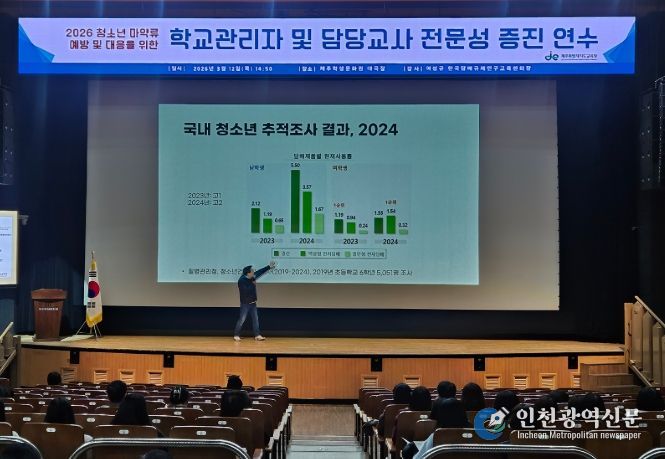 [인천광역신문] 관리자 기자 | 제주특별자치도교육청은 12일 제주학생문화원 대강당에서 도내 학교 관리자와 업무 담당 교사 400여 명을 대상으로 ‘2026 청소년 마약류 예방 및 대응 전문성 증진 연수’를 개최했다.