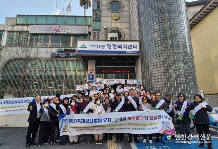 [인천광역신문] 관리자 기자 | 미추홀구 학익1동 행정복지센터는 지난 12일 통장 자율회(회장 홍인숙)와 함께 ‘인천해사국제상사법원 미추홀구 유치’를 위한 지지 선언식을 개최하고 주민 홍보 활동에 본격적으로 나섰다.
