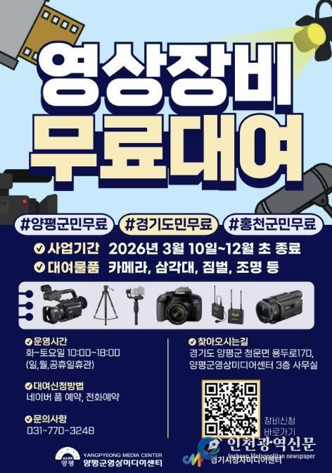 [인천광역신문] 관리자 기자 | 양평군은 2026년 ‘시청자미디어재단 경기센터 장비 지원 사업’ 공모에 2024년과 2025년에 이어 3년 연속 선정돼 올해 12월까지 미디어 장비 대여 서비스를 운영한다고 밝혔다.