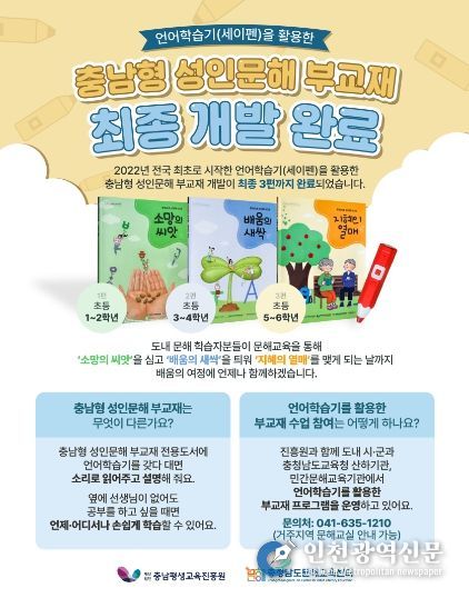 [인천광역신문] 관리자 기자 | 충남평생교육진흥원은 도내 비문해 성인들의 학습권 보장과 자기주도적 학습 환경 조성을 위해‘충남형 성인문해 부교재’3편을 최종 개발 완료하고 본격적인 보급에 나선다고 밝혔다.