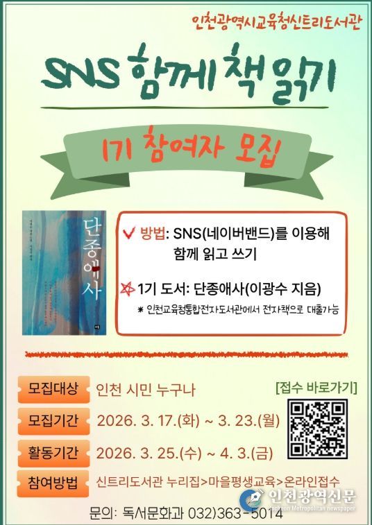 [인천광역신문] 관리자 기자 | 인천광역시교육청신트리도서관은 인천 시민의 일상 속 독서 실천을 지원하기 위해 온라인 독서 프로그램 ‘2026년 SNS 함께 책 읽기’를 운영한다.