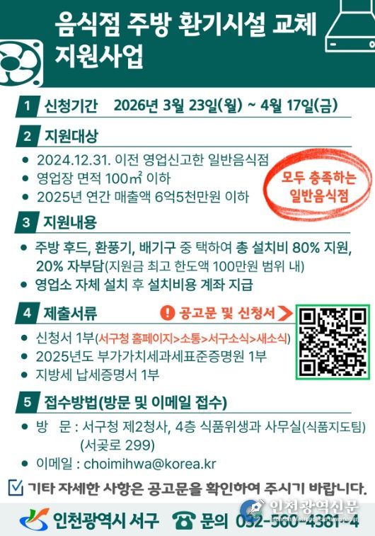 [인천광역신문] 관리자 기자 | 인천 서구는 식품사고 예방과 음식점 주방 환경 개선을 위해 ‘음식점 주방 환기시설 교체 지원사업’을 추진한다고 밝혔다.