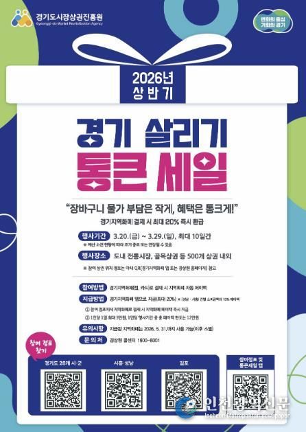 [인천광역신문] 관리자 기자 | 부천시는 관내 전통시장과 골목상권 등 39개 상권에서 3월 20일부터 29일까지 ‘2026년 상반기 경기 살리기 통큰 세일’이 열린다고 18일 밝혔다.