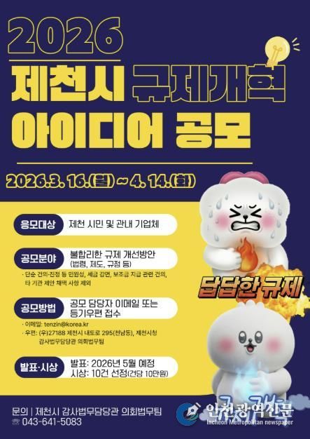 [인천광역신문] 관리자 기자 | 제천시는 불합리한 규제를 발굴해 지역 경제에 활력을 불어넣기 위해 시민들의 창의적인 아이디어를 공모한다.
