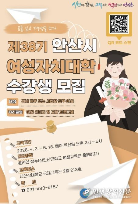 [인천광역신문] 관리자 기자 | 안산시는 지역 여성의 역량 강화와 리더십 함양을 위한 ‘제38기 안산시 여성자치대학’ 수강생을 모집한다고 20일 밝혔다.