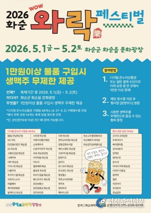 [인천광역신문] 최예준 기자 | 화순군은 오는 5월 1일부터 2일까지 이틀간 화순읍 광덕문화광장 일원에서 ‘2026 화순 와락 페스티벌’을 개최한다고 밝혔다.
